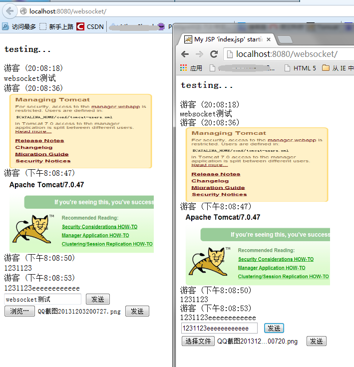 测试一下HTML5的websocket功能,实现了客户端→服务器实时推送信息到客户端,包括推送图片: