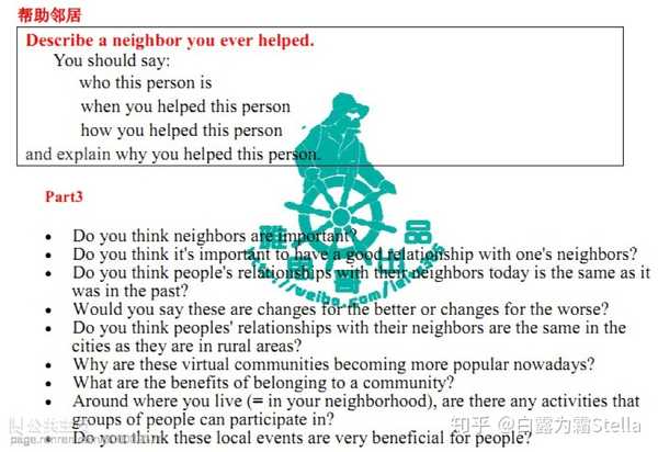 首先分别回答黑框里的问题:Describe a neighbor you ever helped.轮流答完后我们开始进行part3的讨论,我挑选一个问题问她,她回答,在她的回答的基础上我们可以自由讨论;然后,她挑一个问题问我,我回答,同样的我们可以自由讨论。之所以要挑问题,因为1小时的时间我们无法讨论完所有的问题,所以就挑最感兴趣最有表达欲望的话题进行讨论了。