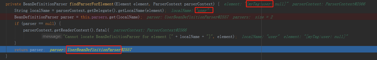 private BeanDefinitionParser findParserForElement(Element element, ParserContext parserContext) { //获取元素名称,也就是<myTag:user中的 user String localName = parserContext.getDelegate().getLocalName(element); //根据 user 找到对应的解析器,也就是在 //registerBeanDefinitionParser("user",new UserBeanDefinitionParser()); //中注册的解析器 BeanDefinitionParser parser = this.parsers.get(localName); if (parser == null) { parserContext.getReaderContext().fatal( "Cannot locate BeanDefinitionParser for element [" + localName + "]", element); } return parser; }