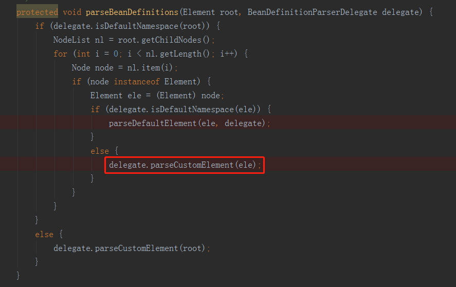 我们看到自定义标签的解析是通过BeanDefinitionParserDelegate.parseCustomElement(ele)进行的,解析来我们进行详细分析。