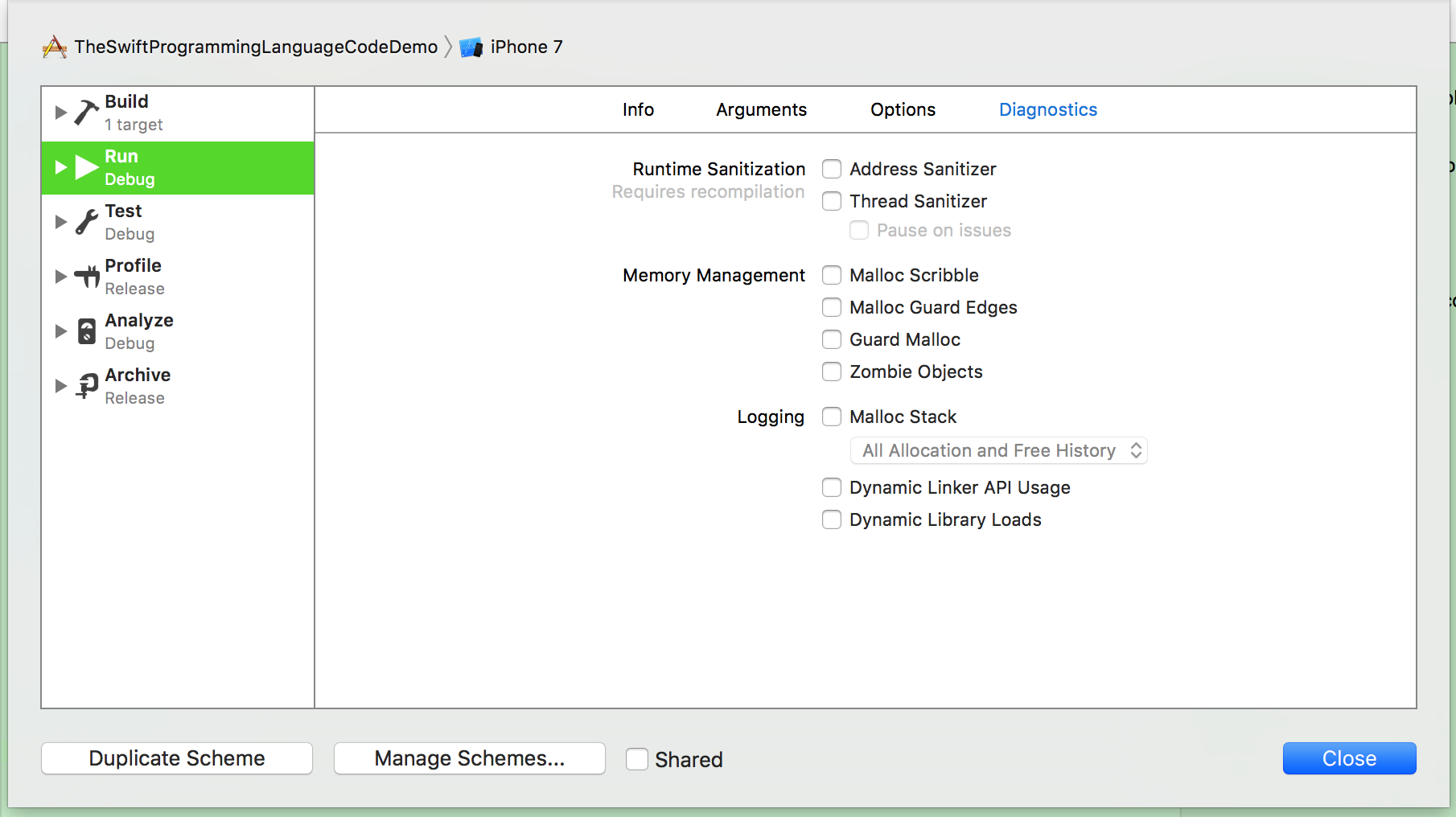也可以在Xcode 里打开此选项,这样的话,Xcode 在运行应用程序时会自动设置环境变量。开启方法:编辑应用程序的 Scheme,在对话框左侧选择 "Run",然后切换至 "Diagnostics" 分页,最后勾选 “Enable Zombie Objects” 选项,图演示了Xcode 的配置对话框,以及启用僵尸对象所需勾选的选项。