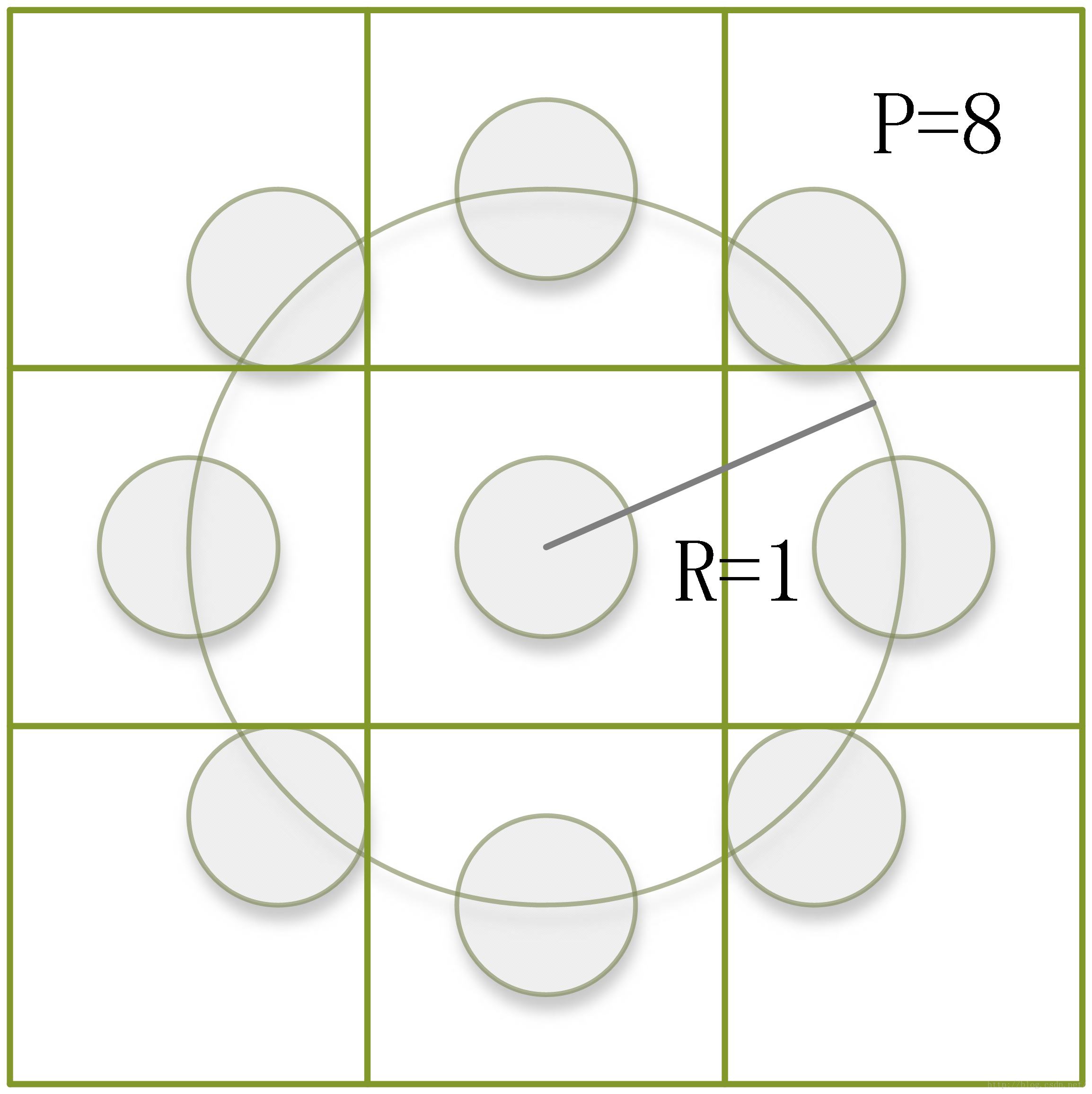 为了更加准确的反映纹理的特性,会采用“圆形”的局部二值模式(下面均是如此)。如下图所示,所谓的“圆形”,只是采样点的选择不同于八邻域。它以中心像素点为圆心,R(pixel)为半径画圆,在圆上均匀地选取P个点作为采样点。而后面的处理方法与前面的八邻域LBP方法一致。下图是R=1(pixel),P=8时的情况。
