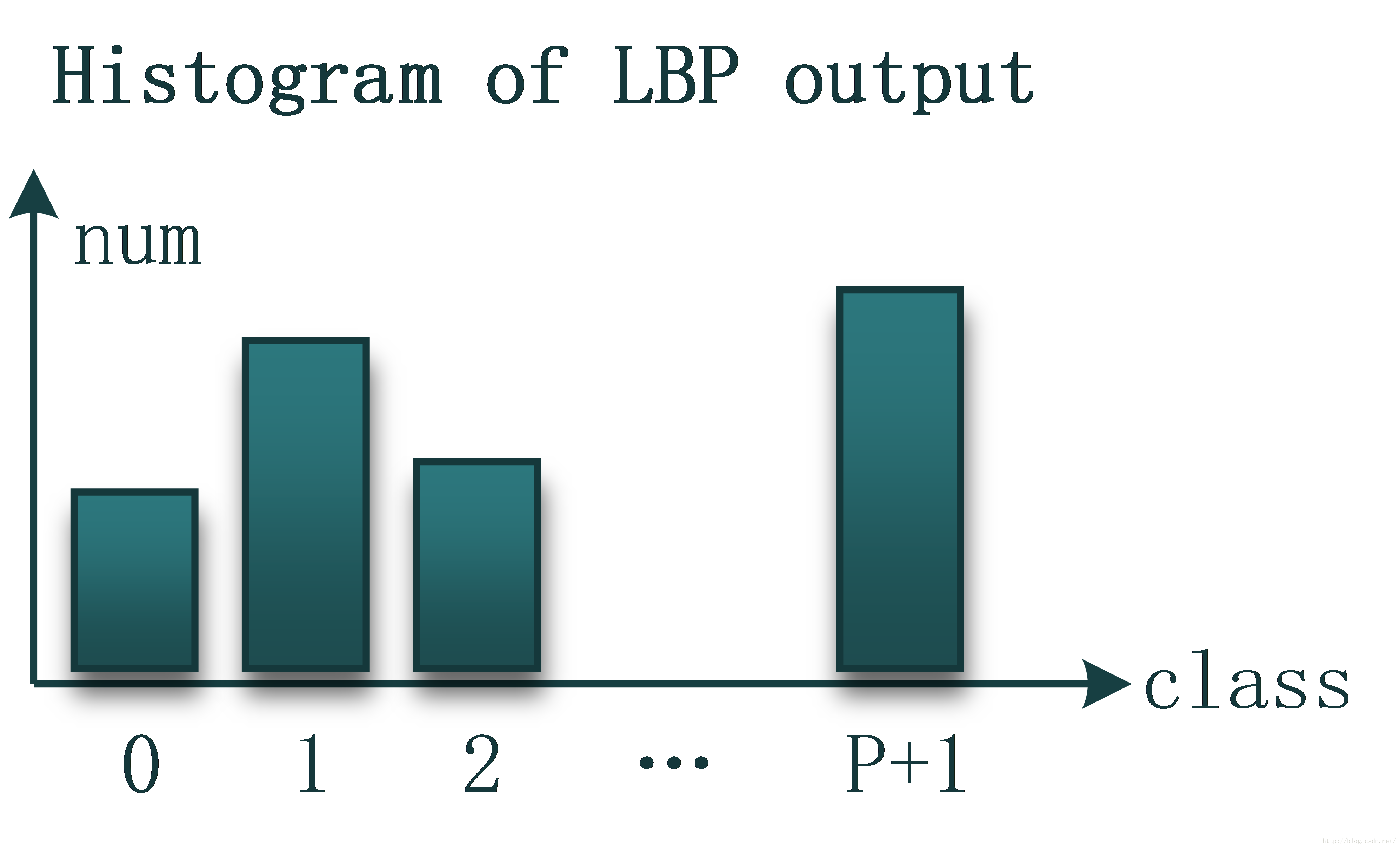 对于一幅图像,每个像素点均可以根据上述方法计算出一个LBP值,从而将这个像素归为(P+2)类中的一类。这样我们可以得到一个特征图,图中每点的数值代表像素点的类别,范围为:0~(P+1)。最终的纹理特征即为:LBP类别特征图的输出直方图。