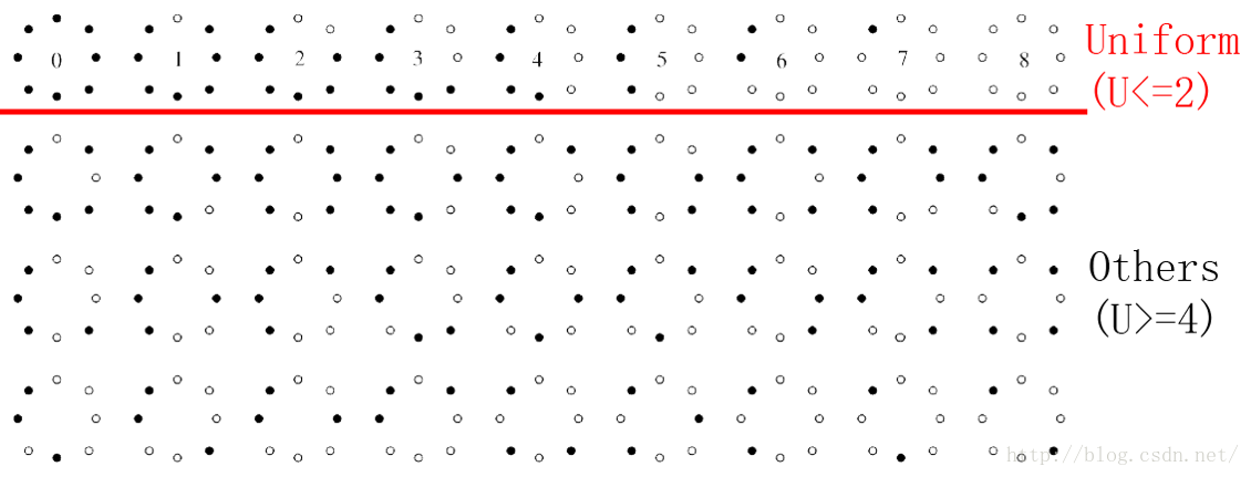 这样,对于一般LBP进行处理时,我们将U值小于等于2的LBP每个单独分为一类,而对于U值大于等于4的LBP全部归为一类,这样一共有P+2类。