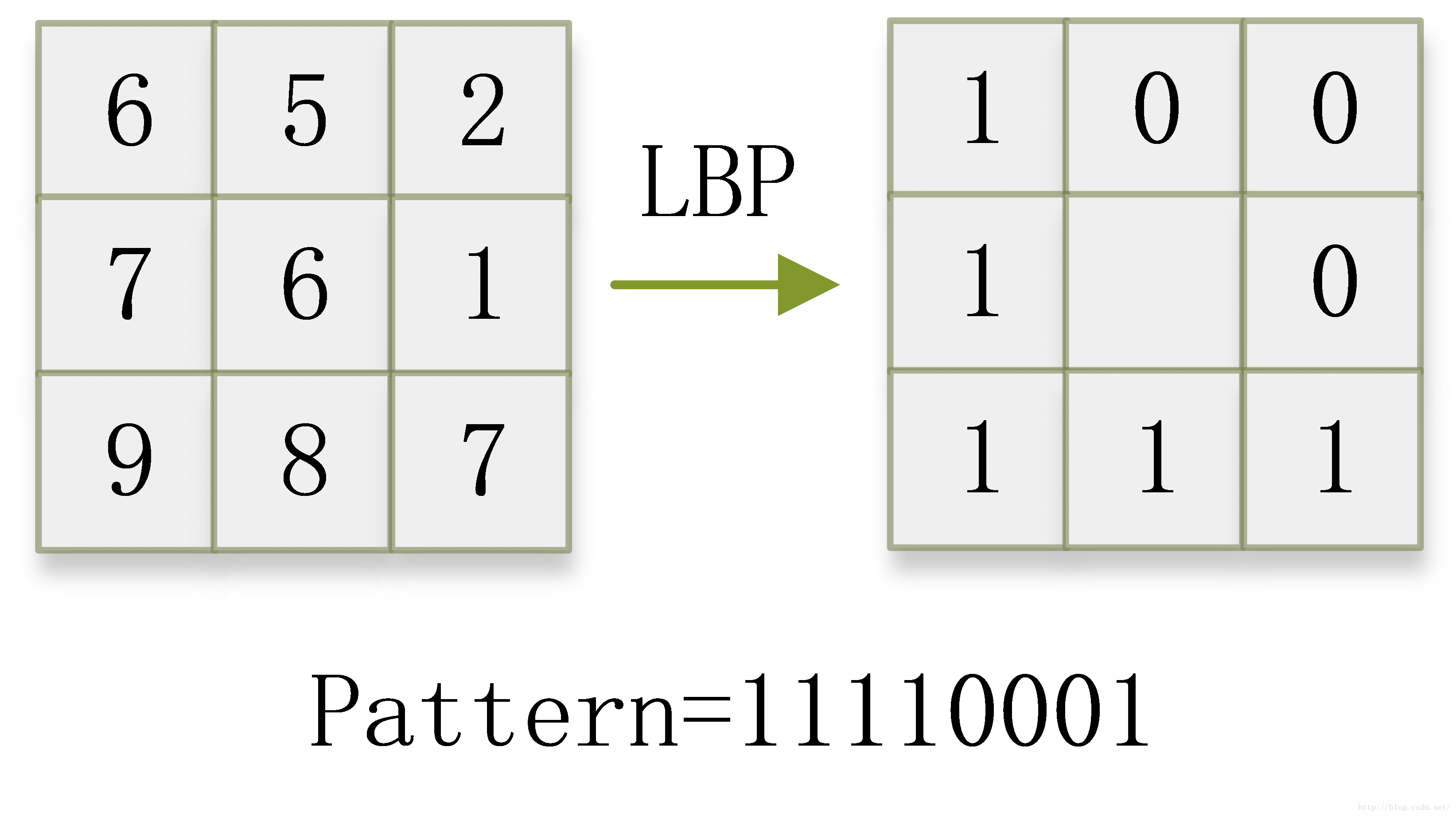 这时,我们定义左边中心像素为起始点,逆时针方向为正方向,然后按顺序数LBP的输出值,便会得到一个LBP编码。这样,我们就称中心像素点的LBP值为11110001。同样,我们对一幅图像的所有像素点进行LBP处理,每个像素点都有一个LBP值,这个值在十进制下介于0到255之间。这样得到的图像称为LBP特征图。