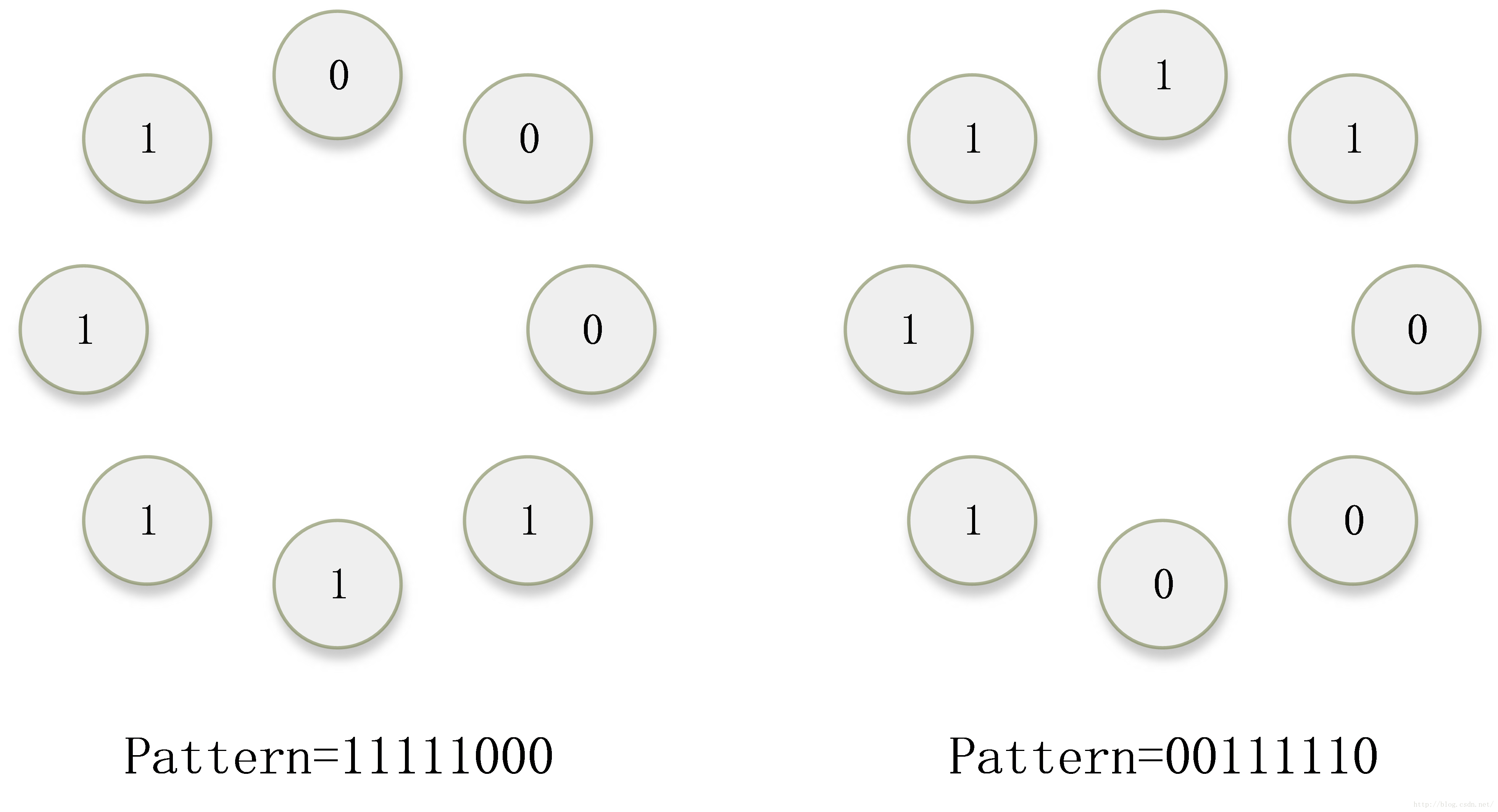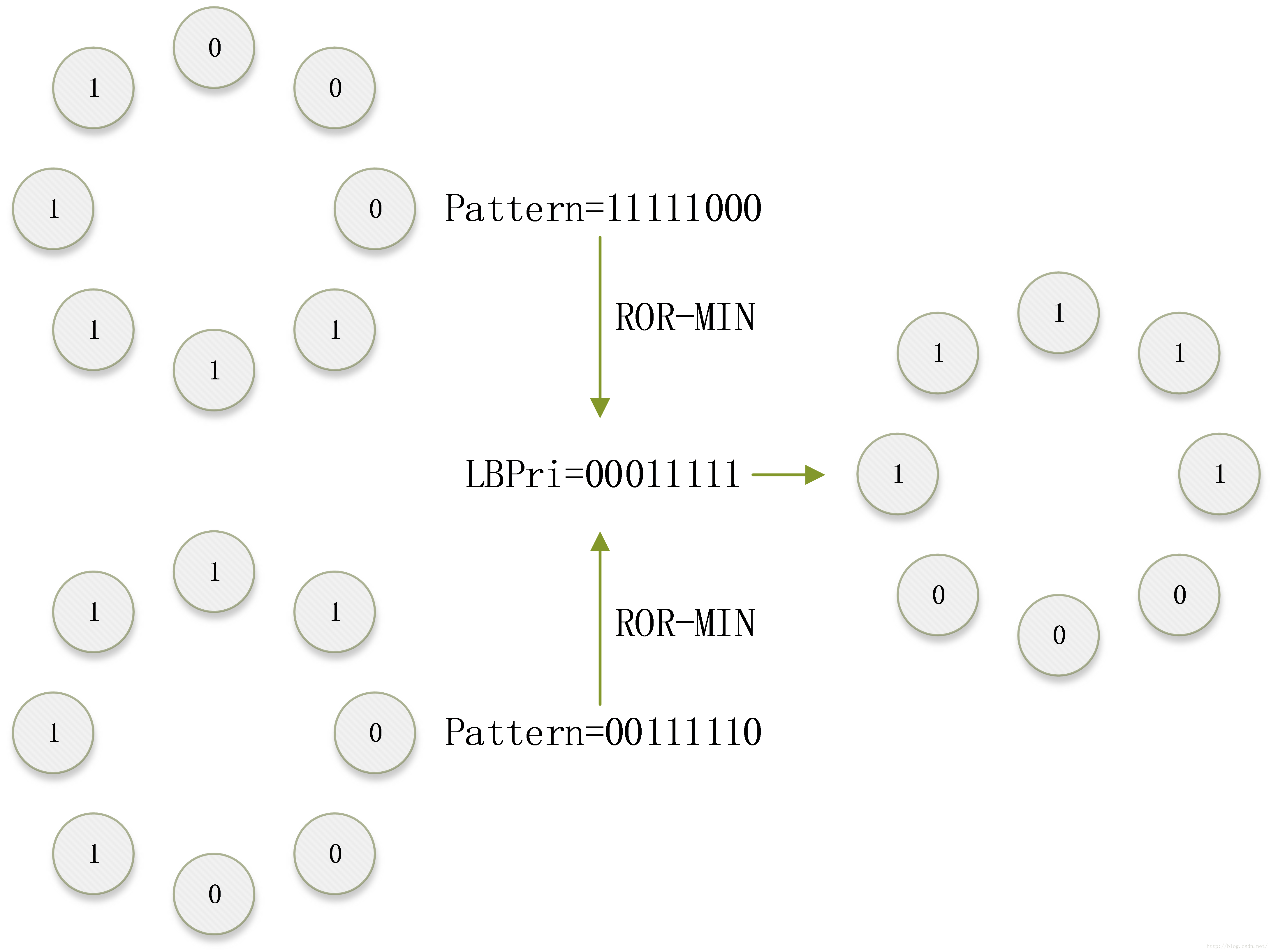 处理方法如下:两种模式各有一个LBP值,将这个LBP值不断的循环右移,并找到一个右移过程中最小的结果,作为新的LBP值。可见,这两种模式得到的新LBP值相同,属于同一种模式,从此解决了方向变化的问题。其中,"循环右移"的实质是对模式图案不断的旋转。"最小化"过程的实质是寻找能量最低的位置。