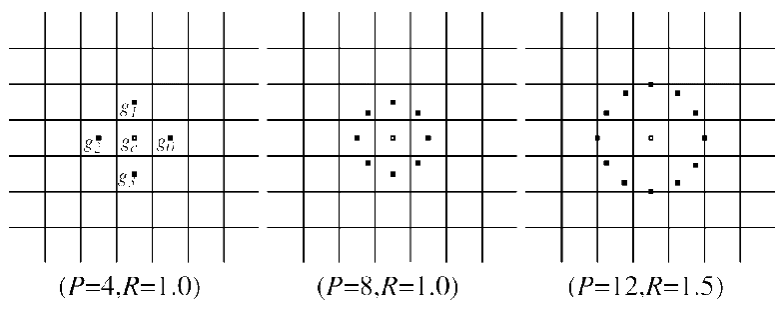 我们可以发现,R的大小决定了圆的大小,反映了二维空间的尺度;而P的大小决定了采样点数,反映了角度空间的分辨率。同样的,我们还可以改变R和P的值,实现不同的尺度和角度分辨率(如下图)。这也是以后“多分辨率分析”的理论基础。