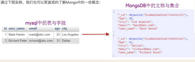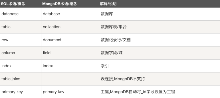 MongoDB中没有表的概念,相较于Mysql的表而言,在MongoDB中以集合的形式存在。MongoDB无需设计表结构所以也就北邮外键字段,直接在数据库中创建集合,然后在集合中插入文档就可以了。文档是MongoDB的核心概念。文档就是键值对的一个有序集{'msg':'hello','foo':3},其结构类似于python中的有序字典。文档相当于Mysql中的记录(就是每一行数据)。MongoDB没有外键,所以表关系全靠个人命名时给出相应提示,这也使得用MongoDB操作数据更加简便。