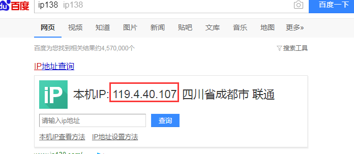 通过百度打开 输入 ip 查询可以查看当前电脑出口的上网IP (如果IP是动态的,这个IP可能随时都会变化)