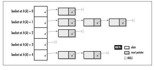 一个由5个buckets组成的哈希表,里面有7个元素: