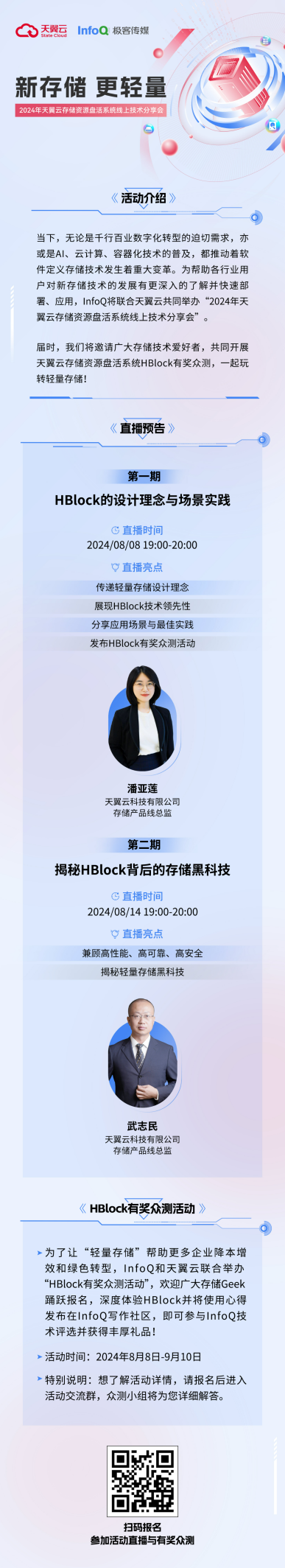 从理念到实践,解构HBlock降本增效黑科技! “新存储 更轻量”天翼云存储资源盘活系统HBlock2024年线上技术分享会来啦!在2023年HBlock分享会之后不少小伙伴积极参与了1PB免费尝鲜活动好评如潮的同时也对HBlock有了更多期待!那么2024年轻量存储技术有哪些突破?HBlock又有哪些新的技术创新或场景实践让我们拭目以待此次分享会将一站式解决您的疑问...