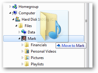 移动文件夹很简单。简单的托过来,拽到新的位置就可以。下面是移动默认的My Music文件夹到我自己定制的个人文件夹(Mark)的截图:
