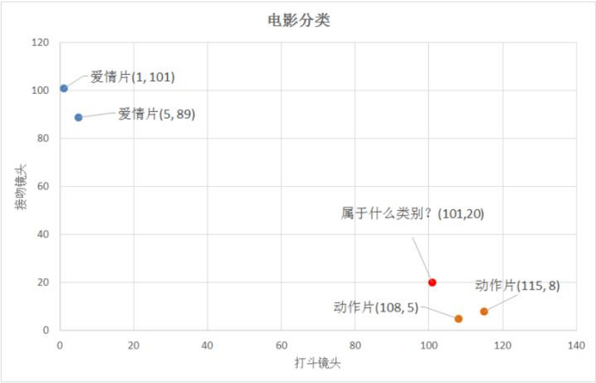 现在我们回到前面电影分类的例子,使用 K-近邻算法分类爱情片和动作片。有人曾经统计过很多电影的打斗镜头和接吻镜头。假设有一部未看过的电影,如何确定它是爱情片还是动作片呢?我们可以使用KNN来解决这个问题。