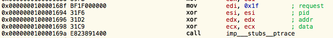 #define PT_TRACE_ME 0 /* child declares it's being traced */ #define PT_READ_I 1 /* read word in child's I space */ #define PT_READ_D 2 /* read word in child's D space */ #define PT_READ_U 3 /* read word in child's user structure */ #define PT_WRITE_I 4 /* write word in child's I space */ #define PT_WRITE_D 5 /* write word in child's D space */ #define PT_WRITE_U 6 /* write word in child's user structure */ #define PT_CONTINUE 7 /* continue the child */ #define PT_KILL 8 /* kill the child process */ #define PT_STEP 9 /* single step the child */ #define PT_ATTACH 10 /* trace some running process */ #define PT_DETACH 11 /* stop tracing a process */ #define PT_SIGEXC 12 /* signals as exceptions for current_proc */ #define PT_THUPDATE 13 /* signal for thread# */ #define PT_ATTACHEXC 14 /* attach to running process with signal exception */ #define PT_FORCEQUOTA 30 /* Enforce quota for root */ #define PT_DENY_ATTACH 31 #define PT_FIRSTMACH 32 /* for machine-specific requests */