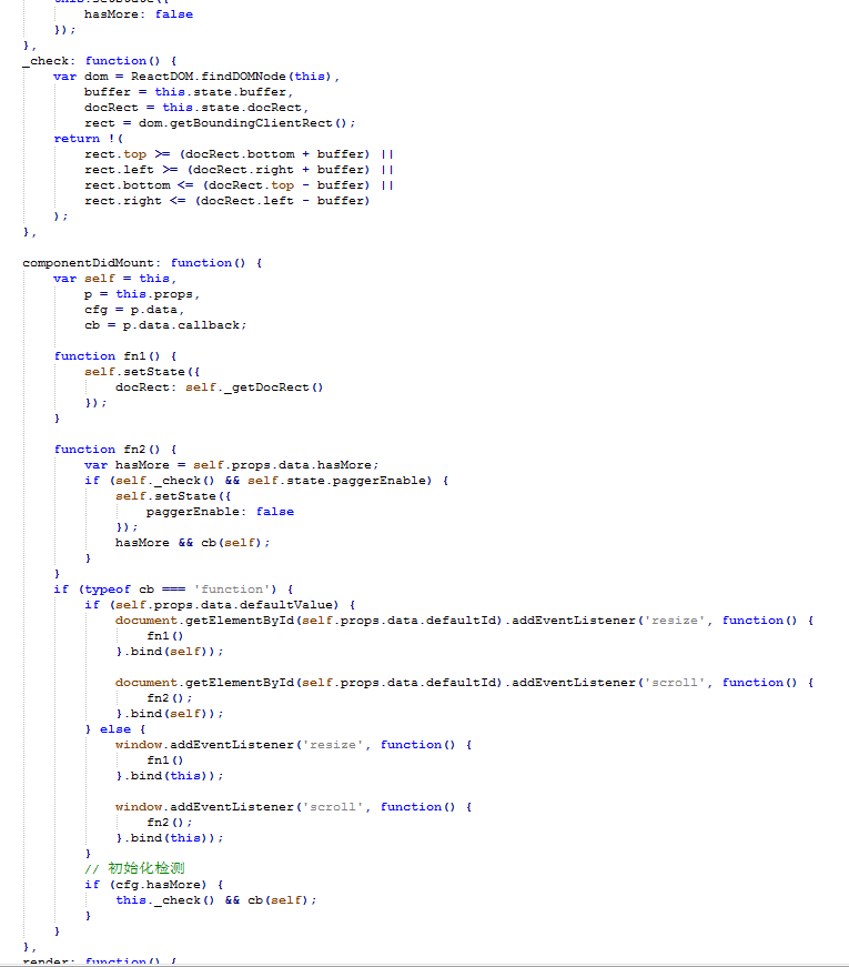 于是开始了前端,原因的定位,首先找想通点:由于我们的项目架构设计,全部的上拉加载都是由一个基础组件pagger 完成的,其部分代码如图所示,原理是通过浏览器的scroll事件和resize事件不停的去检测组件是否在可视区域中,如果是则触发hasMore函数。