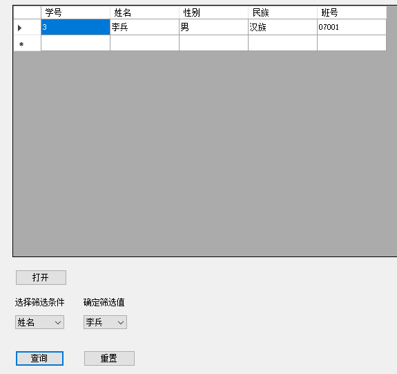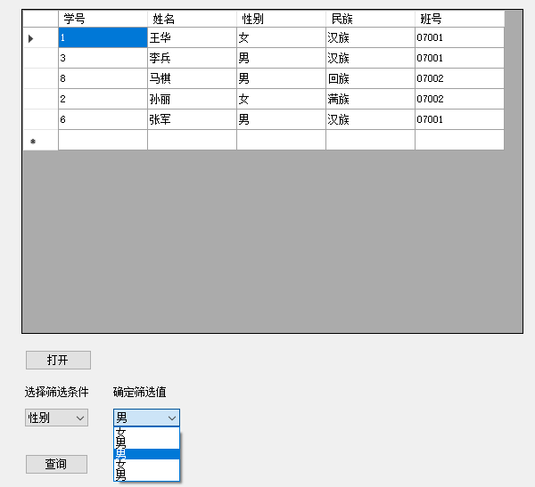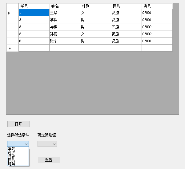 4.那么就到了最后一步了,当我确定了筛选条件之后,如何改变datagridview的值呢,实现同步的更新?