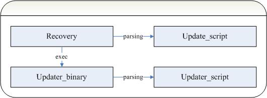 其中密钥文件xxx.pem xxx.pk8 在 build/target/product/security/下就可以找到,signapk.jar是由build/tools/signapk/编译生成的。当然各个厂家为了不混淆自家的升级包文件可能会定制自己的密钥文件。接下来我们来看看update-binary、updater-script、update-script这三个文件。其中update-script是Amend脚本,在Android1.5之前使用的现在已经不再支持,它是由Recovery直接解析执行的。现在使用的updater-script是Edify脚本,是由update-binary解析执行的。后者的好处在于,它完全独立于Recovery系统,在recovery中fork出一个进程来执行update-binary的,而且用户可以扩展供执行的解析命令,这样灵活性很高,可以做的事情越多。