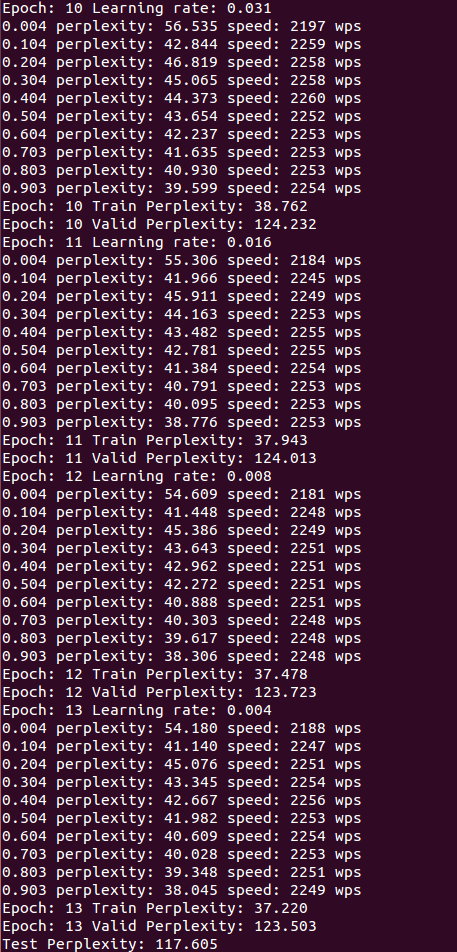 这里简便的放入了最后结果,我们可见,在13个epoch时,我们的测试perplexity为117.605, 对应了论文里non-regularized LSTM的114.5,运行时间约5到6小时。