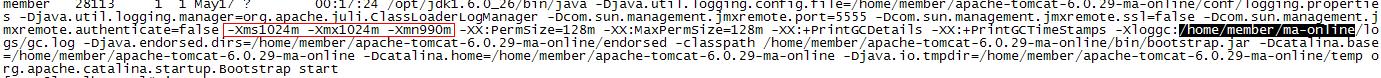 JAVA_OPTS="$JAVA_OPTS -Xms1024m -Xmx1024m -Xmn256m -XX:PermSize=128m -XX:MaxPermSize=128m -XX:SurvivorRatio=22 -XX:MaxTenuringThreshold=6 -XX:+UseConcMarkSweepGC -XX:+UseParNewGC -XX:+PrintGCDetails -XX:+PrintGCTimeStamps -Xloggc:/home/member/ma-online/logs/gc.log"