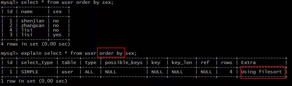 explain select * from user order by sex;