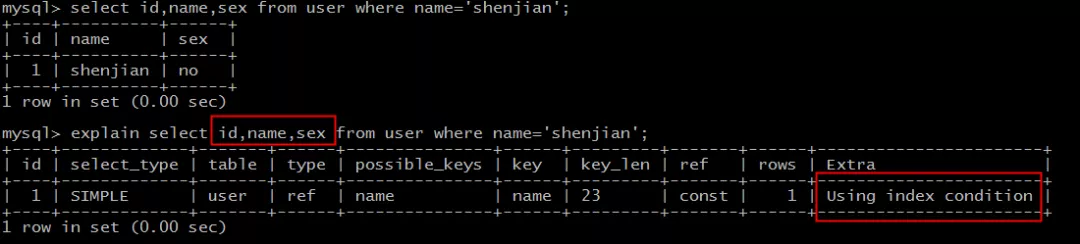 explain select id,name,sex from user where name='shenjian';