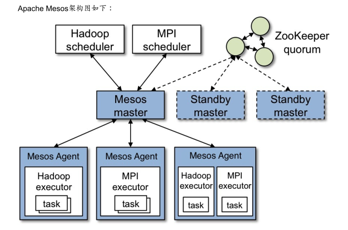 架构图可以看出mesos主要两部分主和从 ,集群依靠zookeeper