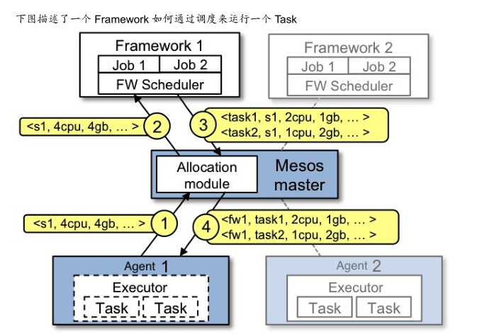 运行流程是,Agent1向 mesos master注册,mesos master向Framework 1报告有哪些资源,Framework 1 告诉mesos master有两个任务运行(taks1,task2) ,mesos master向