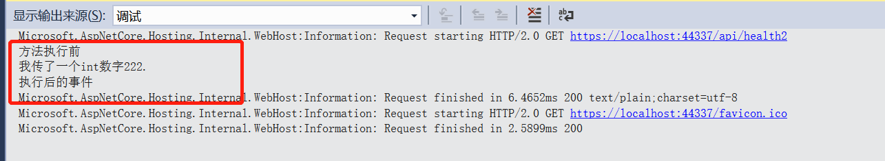 // 添加健康检查路由地址 app.Map("/api/health2", (applicationBuilder) => { applicationBuilder.Run(context => { IUserService userService = new UserService(); //执行代理 var serviceProxy = new ProxyDecorator<IUserService>(); IUserService user = serviceProxy.Create(userService, beforeEvent, afterEvent); // Task<string> uName = user.GetUserName(222); context.Response.ContentType = "text/plain;charset=utf-8"; return context.Response.WriteAsync(uName.Result, Encoding.UTF8); }); });
