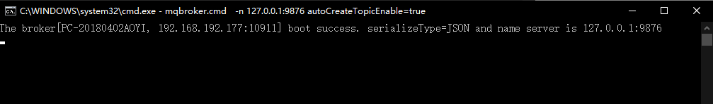 进入E:\aibaiyang\rocketmq-all-4.3.2-bin-release\rocketmq-all-4.3.2-bin-release\bin 目录,执行命令:start mqbroker.cmd -n 127.0.0.1:9876 autoCreateTopicEnable=true