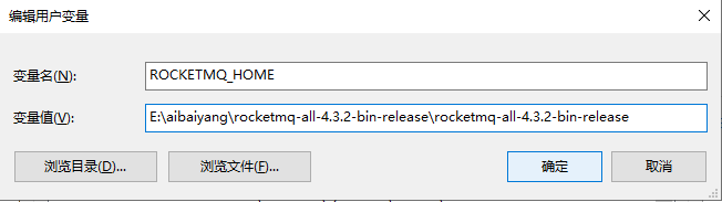 变量值:E:\aibaiyang\rocketmq-all-4.3.2-bin-release\rocketmq-all-4.3.2-bin-release