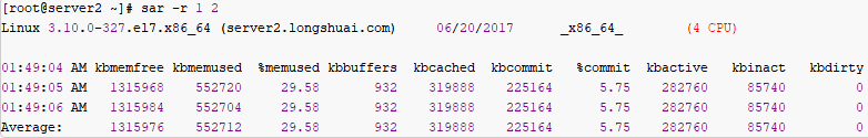 [root@server2 ~]# sar -d -p 1 2 Linux 3.10.0-327.el7.x86_64 (server2.longshuai.com) 06/20/2017 _x86_64_ (4 CPU) 12:53:06 AM DEV tps rd_sec/s wr_sec/s avgrq-sz avgqu-sz await svctm %util 12:53:07 AM sda 0.00 0.00 0.00 0.00 0.00 0.00 0.00 0.00 12:53:07 AM DEV tps rd_sec/s wr_sec/s avgrq-sz avgqu-sz await svctm %util 12:53:08 AM sda 0.00 0.00 0.00 0.00 0.00 0.00 0.00 0.00 Average: DEV tps rd_sec/s wr_sec/s avgrq-sz avgqu-sz await svctm %util Average: sda 0.00 0.00 0.00 0.00 0.00 0.00 0.00 0.00