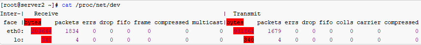 关注列:receive和transmit分别表示收包和发包,关注每个网卡的bytes即可获得网卡的情况。写一个脚本计算每秒的差值即为网络流量。