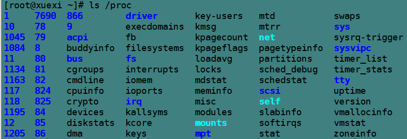 非数字命名的目录各有用途,例如bus表示总线信息,driver表示驱动信息,fs表示文件系统特殊信息,net表示网络信息,tty表示跟物理终端有关的信息,最特殊的两个是/proc/self和/proc/sys。