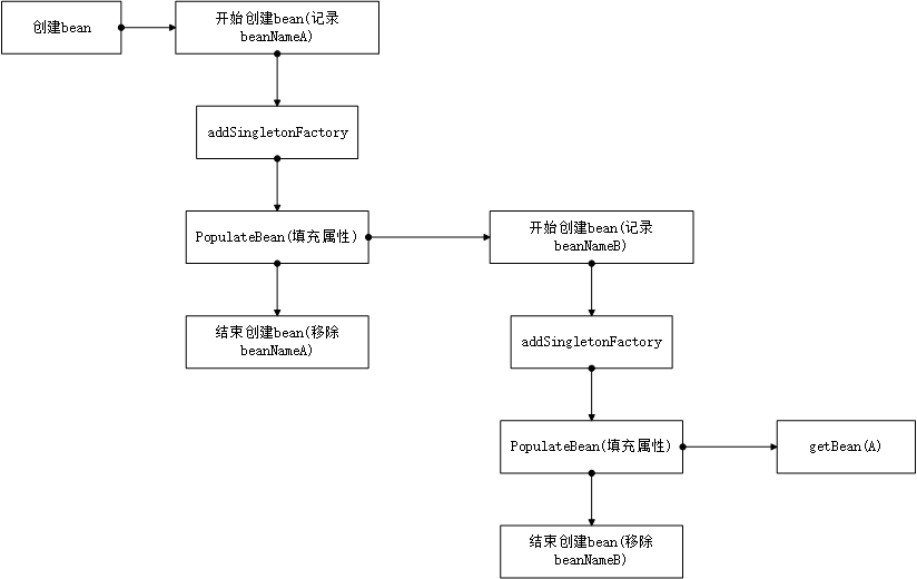 我们以最简单的AB循环依赖为例,类A中有属性类B,类B中有属性类A,那么初始化beanA的过程如下图所示: