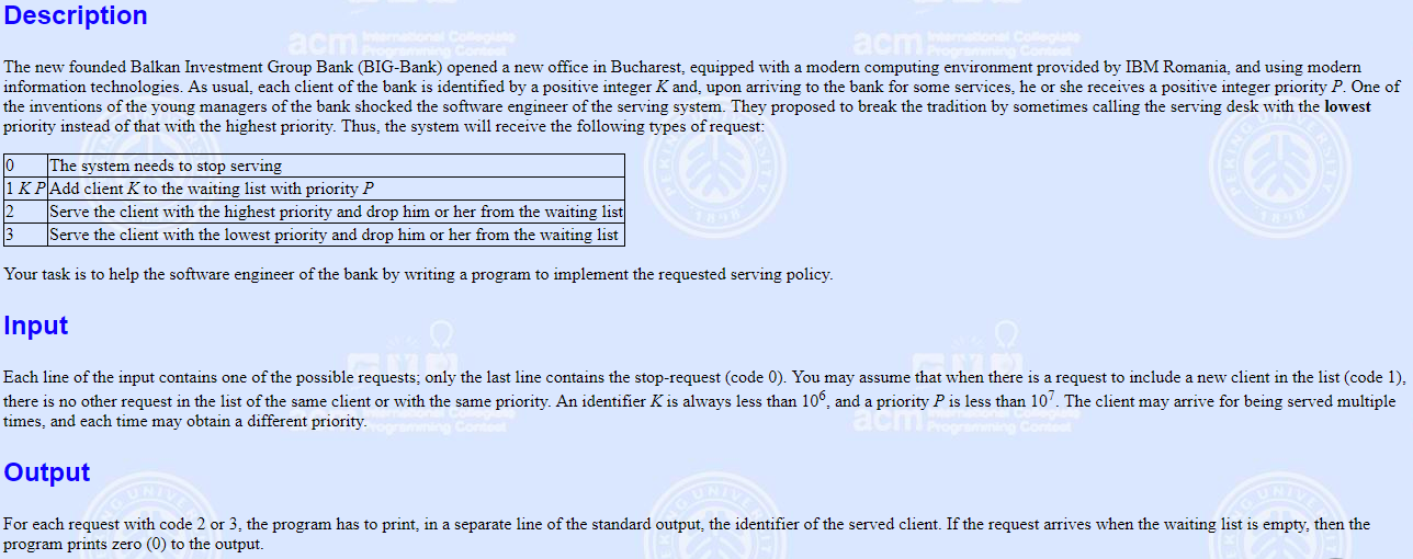 #include<iostream> #include<cmath> #include<cstring> #include<cstdio> #include<algorithm> #include<set> using namespace std; struct ss{ int k,p; bool operator < (const ss &a) const{ if(p==a.p) return k<a.k; return p<a.p; } }a; set<ss>sl; int main() { //freopen("1.txt","r",stdin); int n; while(scanf("%d",&n)==1) { if(n==1) { scanf("%d%d",&a.k,&a.p); sl.insert(a); } if(n==3) { if(sl.empty()) printf("0\n"); else { a=*(sl.begin()); printf("%d\n",a.k); sl.erase(a); } } if(n==2) { if(sl.empty()) printf("0\n"); else { a=*(--sl.end()); printf("%d\n",a.k); sl.erase(a); } } if(n==0) return 0; } return 0; }