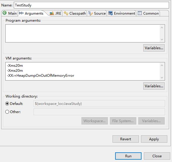 设置JVM的启动参数可在“Run》Run Configuration》Arguments》Vm arguments”中填写