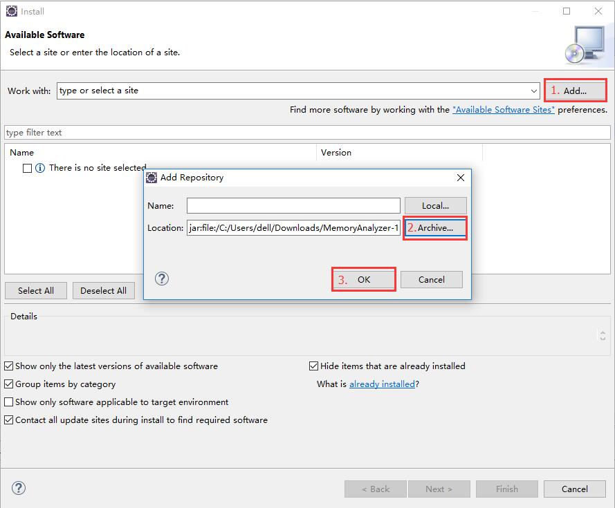 但是由于镜像连接不稳定性,我使用的是下载压缩包zip然后安装,压缩包下载地址为:http://ftp.jaist.ac.jp/pub/eclipse/mat/1.7/MemoryAnalyzer-1.7.0.201706130745.zip