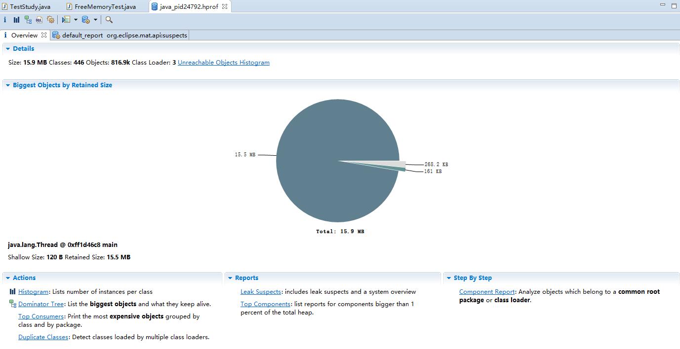 由于MAT是依赖于生成的堆转储快照,而不是在运行的时候自动捕获,因此,再确认进入MAT的工作空间后,点击"File》Open Heap Dump》选择刚生成的“java_pid24792.hprof”文件,一直默认就可以查看内存问题的分析图表以及GC根