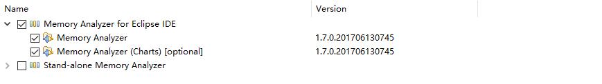 确定之后勾选"Memory Analyzer for Eclipse IDE"下面的两项即可,这个是用于Eclipse内部使用的插件,下面一个“Stand-alone Memory Analyzer“是独立的分析工具,一般不用勾选。