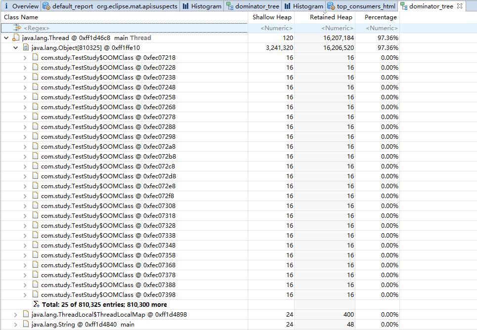 可以看到列出额其中的25条,还有810300条目未列出,这81万个对象占据了97.36%的堆空间,因此不难发现是OOMClass类的对象生成过多为未被回收导致内存溢出。