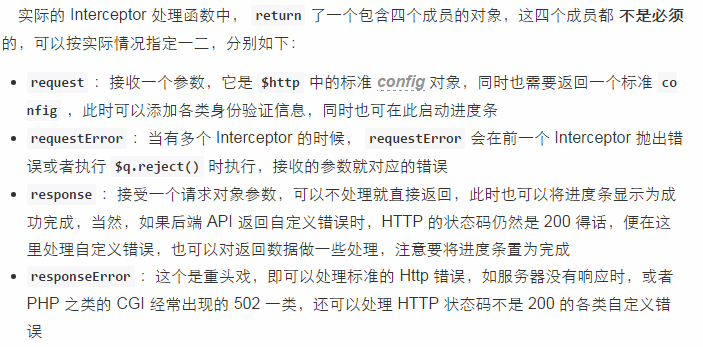 var app = angular.module('app', []); // 定义一个 Service ,稍等将会把它作为 Interceptors 的处理函数 app.factory('HttpInterceptor', ['$q', HttpInterceptor]); function HttpInterceptor($q) { return { request: function(config){ return config; }, requestError: function(err){ return $q.reject(err); }, response: function(res){ return res; }, responseError: function(err){ if(-1 === err.status) { // 远程服务器无响应 } else if(500 === err.status) { // 处理各类自定义错误 } else if(501 === err.status) { // ... } return $q.reject(err); } }; } // 添加对应的 Interceptors app.config(['$httpProvider', function($httpProvider){ $httpProvider.interceptors.push(HttpInterceptor);