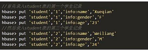 格式如下 put ‘表命’,‘行键’,‘列族:列’,‘值’