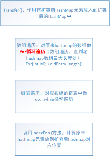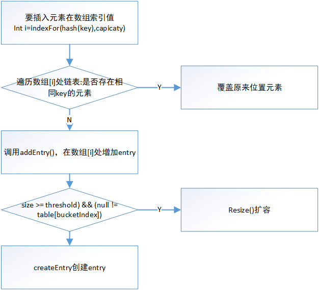 public V put(K key, V value) { //判断当前Hashmap(底层是Entry数组)是否存值(是否为空数组) if (table == EMPTY_TABLE) { inflateTable(threshold);//如果为空,则初始化 } //判断key是否为空 if (key == null) return putForNullKey(value);//hashmap允许key为空 //计算当前key的哈希值 int hash = hash(key); //通过哈希值和当前数据长度,算出当前key值对应在数组中的存放位置 int i = indexFor(hash, table.length); for (Entry<K,V> e = table[i]; e != null; e = e.next) { Object k; //如果计算的哈希位置有值(及hash冲突),且key值一样,则覆盖原值value,并返回原值value if (e.hash == hash && ((k = e.key) == key || key.equals(k))) { V oldValue = e.value; e.value = value; e.recordAccess(this); return oldValue; } } modCount++; //存放值的具体方法 addEntry(hash, key, value, i); //在hashmap tabel【i】创建entry return null; } put()方法中hashmap tabel【i】创建entry方法addEntry()中会判断是否需要resize void addEntry(int hash, K key, V value, int bucketIndex) { //1、判断当前个数是否大于等于阈值 //2、当前存放是否发生哈希碰撞 //如果上面两个条件否发生,那么就扩容 if ((size >= threshold) && (null != table[bucketIndex])) { //扩容,并且把原来数组中的元素重新放到新数组中 resize(2 * table.length); hash = (null != key) ? hash(key) : 0; bucketIndex = indexFor(hash, table.length); } createEntry(hash, key, value, bucketIndex); }
