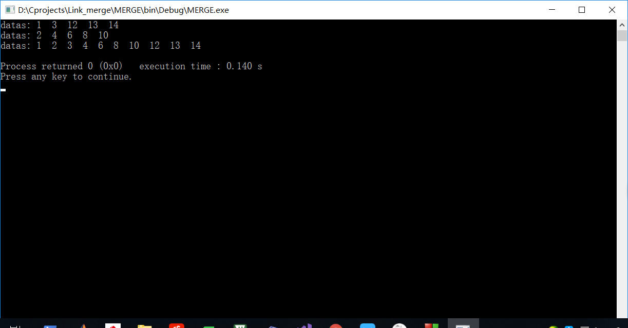 int main() { int a[5]={1,3,12,13,14}; int b[5]={2,4,6,8,10}; Linklist L1; Linklist L2; Linklist L3; int i; L1 = (Lnode*)malloc(sizeof(Lnode)); L1->next = NULL; L1->data = 0; L2 = (Lnode*)malloc(sizeof(Lnode)); L2->next = NULL; L2->data = 0; L3 = (Lnode*)malloc(sizeof(Lnode)); L3->next = NULL; L3->data = 0; for(i=0;i<5;i++){ Linklist_biu(L1,a[i]); Linklist_biu(L2,b[i]); } Linklist_print(L1); Linklist_print(L2); MergeList(L1,L2,&L3); Linklist_print(L3); return 0; }