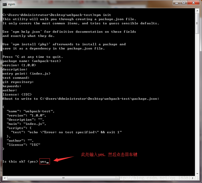 输入npm init 一直点击回车键 当出现Is this ok?时 输入yes,然后点击回车键