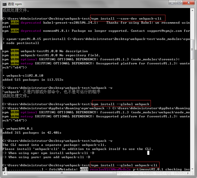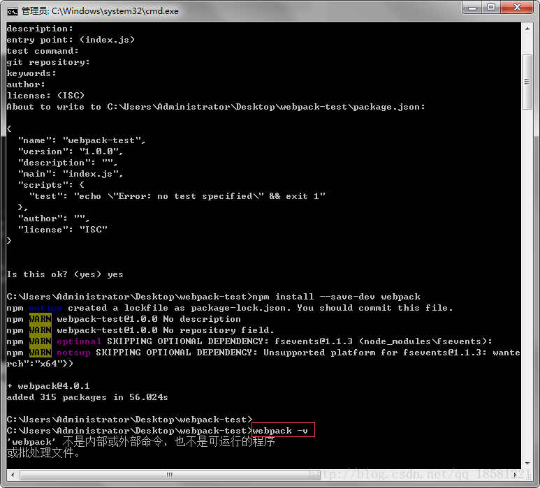 这时候使用 webpack -v 会出现’webpack’ 不是内部或外部命令,也不是可运行的程序或批处理文件。