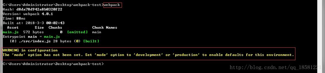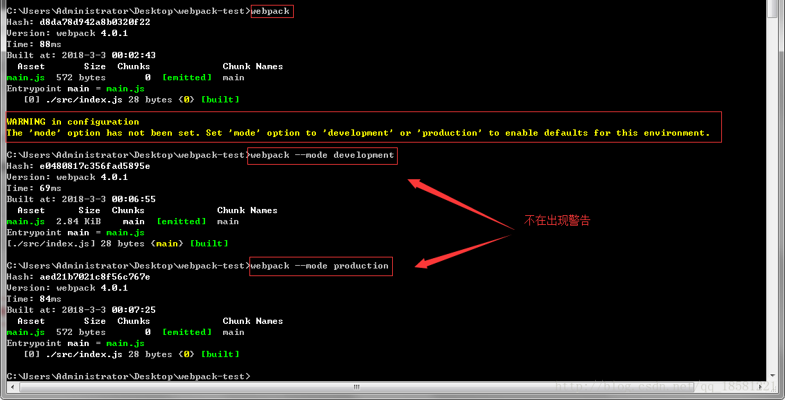打包成功 但是还有一个警告 WARNING in configuration The ‘mode’ option has not been set. Set ‘mode’ option to ‘development’ or ‘production’ to enable defaults for this environment.是因为使用webpack没有指定mode为 development(开发模式)或者为production(生产模式)