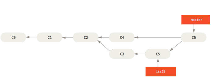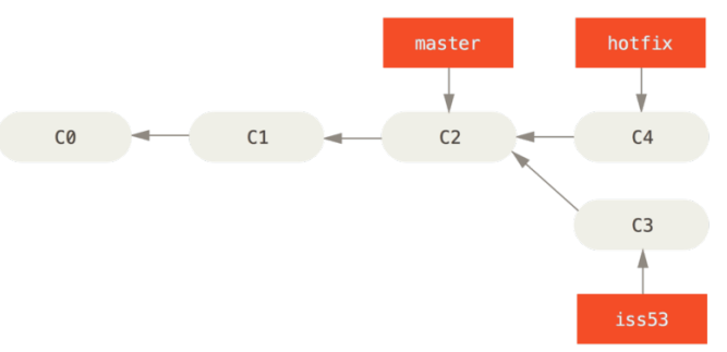 如上图,由于master分支所指向的提交时你当前提交(有关hotfix的提交)的直接上游,所以git只是简单的将指针向前移动。换句话说,当试图合并master分支与hotfix分支时,如果顺着一个个分支走下去能够到达另一个分支,那么git在合并两者的时候,只会简单的将指针向前推进(指针右移),因为这种情况下的合并操作并没有需要解决的分歧--这就叫做快进(fast-forward)。