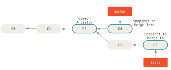 fastforward合并的情况是两个分支所指向的提交时直接祖先,而三方合并(如上图)master分支与iss53分支所指向的提交并没有直接祖先,但它们都指向一个共同祖先C2,此时可利用两个分支的末端所指向的快照(C4和C5)以及两个分支的共同祖先(C2),做个简单的三方合并,三方合并的结果是做一个新的快照并且自动创建一个新的提交指向它(如下图)。这个称为一次合并提交。